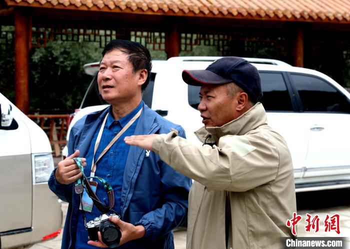 圖為河南攝影師高均海(左)與稱多縣攝影師交流。薛蒂 攝