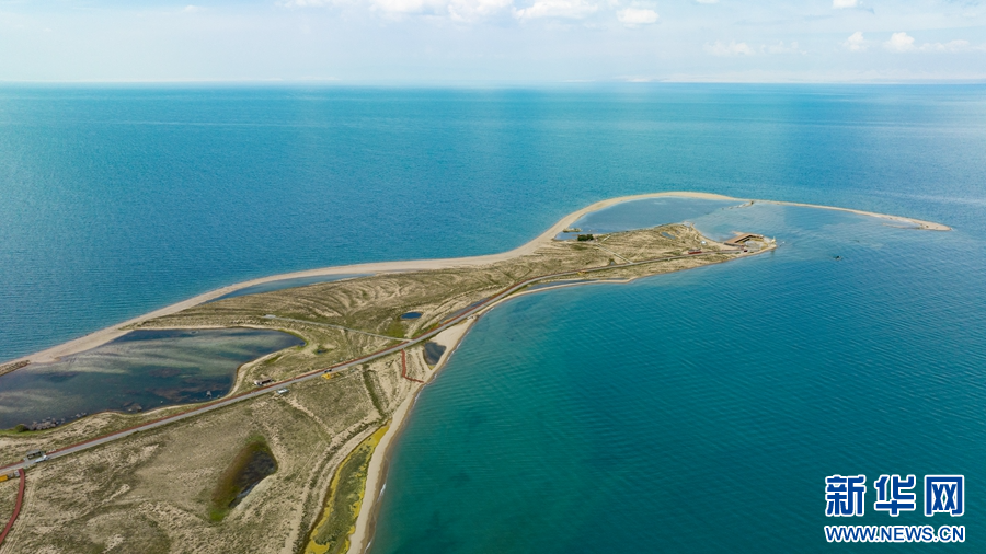 這是8月2日拍攝的青海湖二郎劍景區(qū)二郎劍半島。(無(wú)人機(jī)照片)新華網(wǎng) 郭勇良 攝