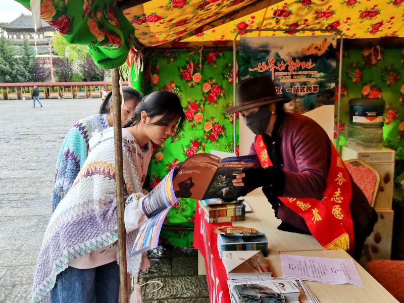 在服務(wù)點(diǎn),游客可以獲取香格里拉各旅游景點(diǎn)、旅游路線和當(dāng)下活動(dòng)的信息介紹,以及景區(qū)門票預(yù)訂指引,還可隨意取閱各類旅游宣傳手冊、旅游地圖和旅游書籍等。來自廣州的游客李先生通過服務(wù)點(diǎn)志愿者的指引到古城旅游服務(wù)中心購買了至普達(dá)措景區(qū)的直通車票和景區(qū)門票?!爸安惶私?,到這兒問了問才知道,可以直接搭乘景區(qū)大巴車到普達(dá)措,這樣方便了不少?!崩钕壬f。