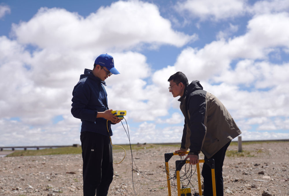 科考隊(duì)員董士琦(左)和范越在長江北源楚瑪爾河附近進(jìn)行地質(zhì)雷達(dá)探測(7月29日攝)。新華社記者 陳杰 攝