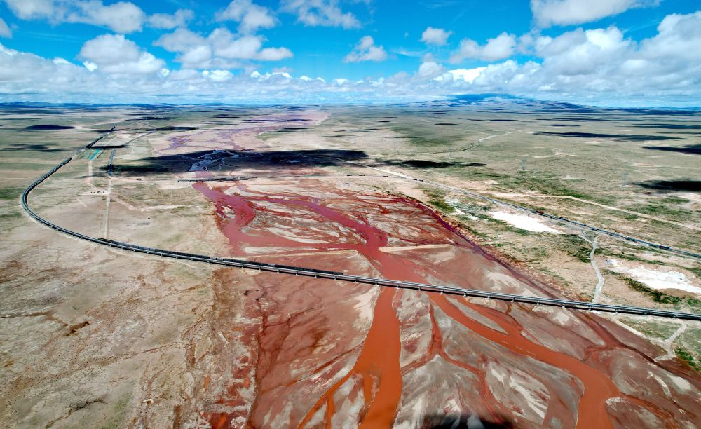 青藏鐵路列車通過辮狀河道的長江北源楚瑪爾河(7月29日攝,無人機(jī)照片)。新華社記者 劉詩平 攝
