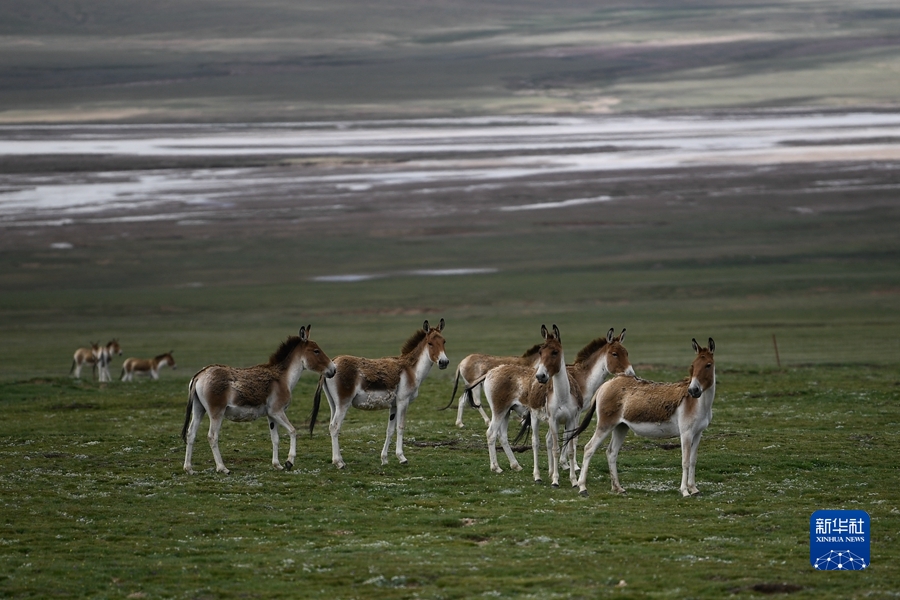 2022年3月12日,在三江源國家公園黃河源園區(qū)內(nèi),一群藏野驢在草灘上吃草。新華社記者 呂雪莉 攝