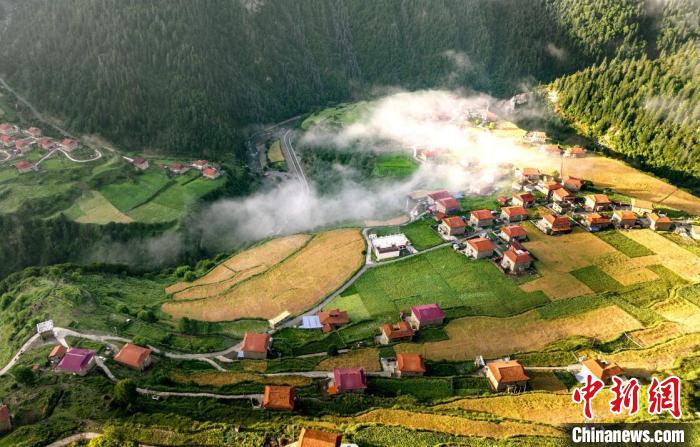 金色的青稞、鄉(xiāng)村及遠山相映成趣,構成一幅鄉(xiāng)村田園畫卷。楊正紅 攝