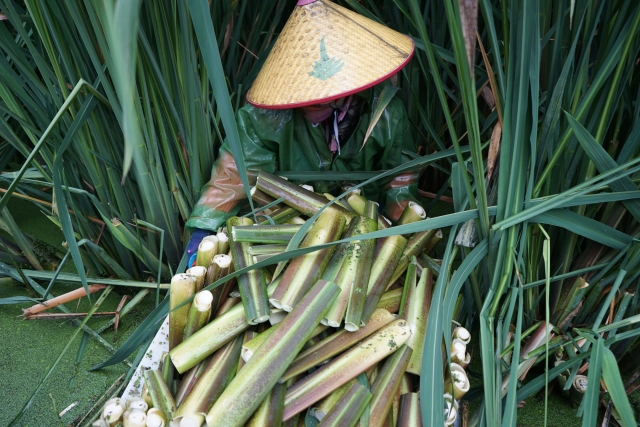走到田間,只見(jiàn)十余名務(wù)工人員腳穿水鞋,頭頂斗笠,手拿彎刀向下一揮,再去頭割尾,一顆光潔的茭白便采割完成了。采割好的茭白在岸邊經(jīng)過(guò)簡(jiǎn)單清洗后,便運(yùn)往冷庫(kù)包裝,銷往各地。