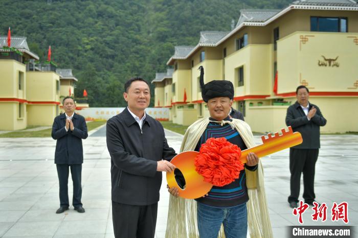9月5日,在四川甘孜州瀘定縣磨西鎮(zhèn)大杉樹村(幸福新村)集中安置點(diǎn),甘孜州委書記沈陽(左)向村民代表發(fā)放新房鑰匙。中新社記者 劉忠俊 攝