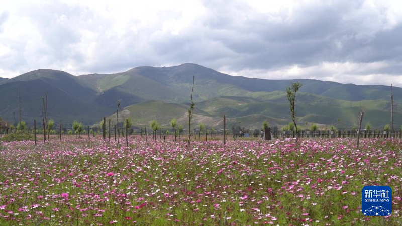 難以置信的是,這里曾是一片沙化嚴(yán)重的草場,當(dāng)?shù)卮迕窨總鹘y(tǒng)放牧已難以為繼。2016年以來,當(dāng)?shù)卣脤嵤┥鷳B(tài)治理工程的契機(jī),整合涉農(nóng)涉旅資金,大面積種植格桑花,打造出近1600畝的色拉花海。