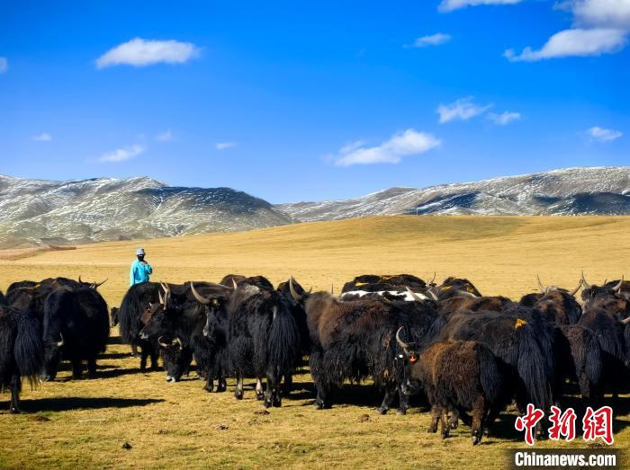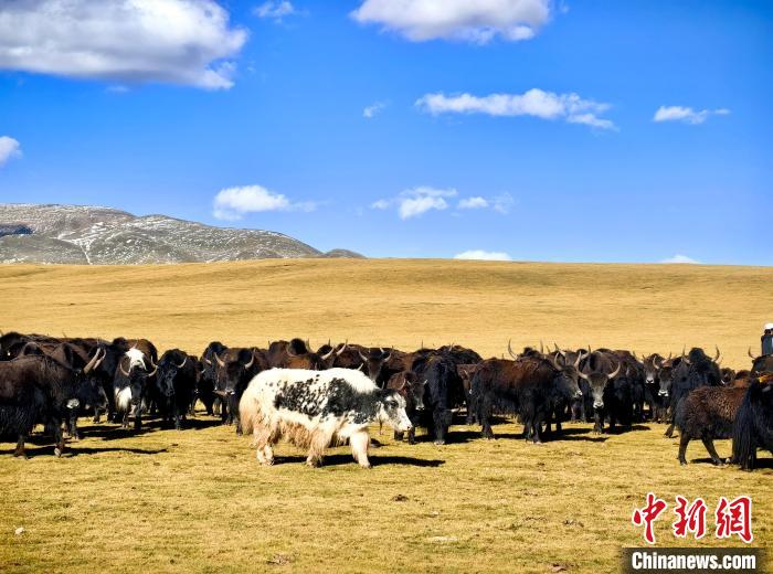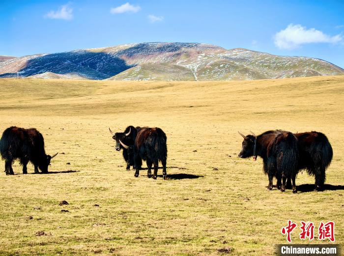 9月20日,青海省玉樹(shù)藏族自治州曲麻萊縣生態(tài)牧場(chǎng)牧草已逐漸泛黃。藍(lán)天白云下,遼闊的金色草原間,成群的牦牛正悠閑吃草,成為秋日草原一道靚麗風(fēng)景線。
