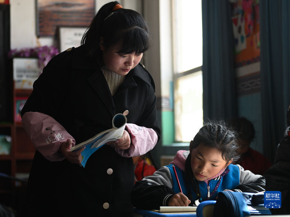 在曲麻萊縣葉格鄉(xiāng)幼兒園,教師旦增卓瑪(右)在課堂上和小朋友互動(dòng)(9月13日攝)。新華社 張宏祥 攝