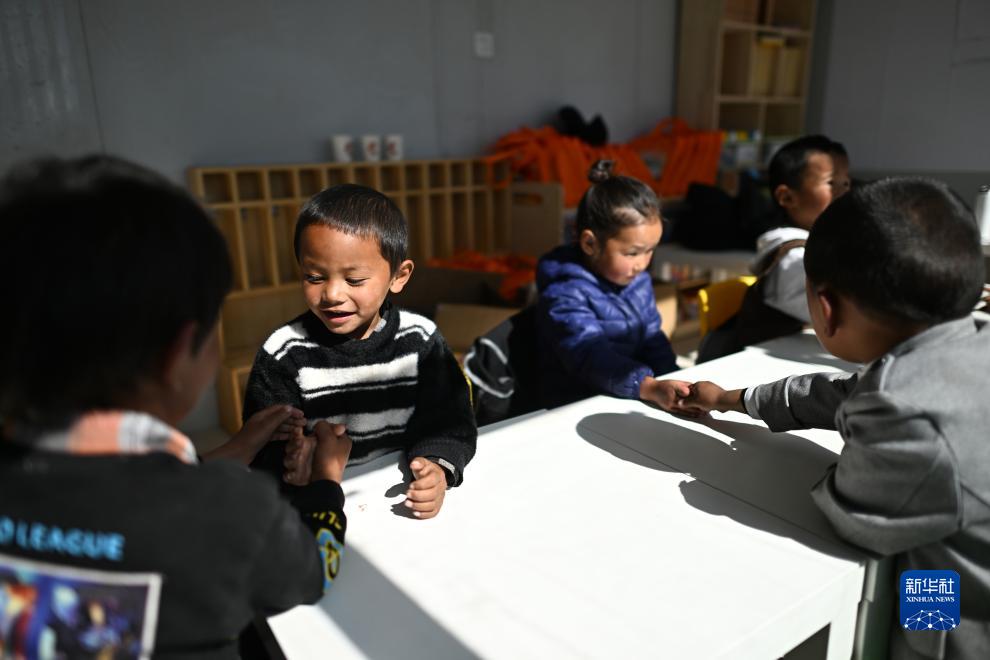 在青海省玉樹(shù)藏族自治州曲麻萊縣秋智鄉(xiāng)布甫村陽(yáng)光幼兒園,普松東周(左二)和伙伴們?cè)诮淌覂?nèi)玩耍(9月14日攝)。新華社記者 韓方方 攝