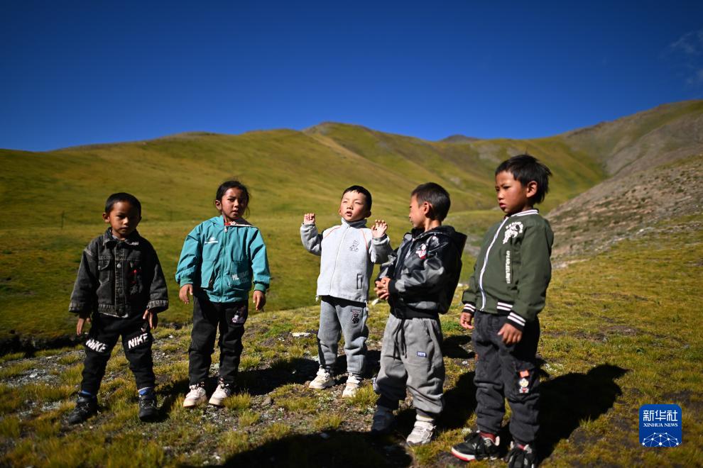 在青海省玉樹(shù)藏族自治州曲麻萊縣秋智鄉(xiāng)布甫村陽(yáng)光幼兒園,歐周挪吾(左三)和伙伴們?cè)诮淌彝獾牟菰铣瑁?月14日攝)。新華社記者 張宏祥 攝