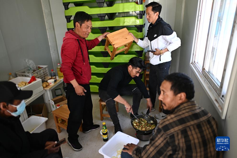 在青海省玉樹(shù)藏族自治州曲麻萊縣秋智鄉(xiāng)布甫村陽(yáng)光幼兒園,秋智鄉(xiāng)幼兒園副園長(zhǎng)才仁戰(zhàn)斗(左三)在板房?jī)?nèi)為孩子們準(zhǔn)備午餐(9月14日攝)。新華社記者 張宏祥 攝