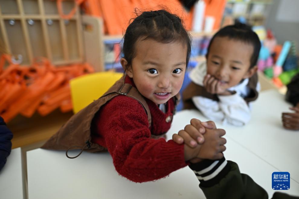 在青海省玉樹(shù)藏族自治州曲麻萊縣秋智鄉(xiāng)布甫村陽(yáng)光幼兒園,丁增巴桑(左)和伙伴們?cè)诮淌覂?nèi)玩耍(9月14日攝)。新華社記者 張宏祥 攝