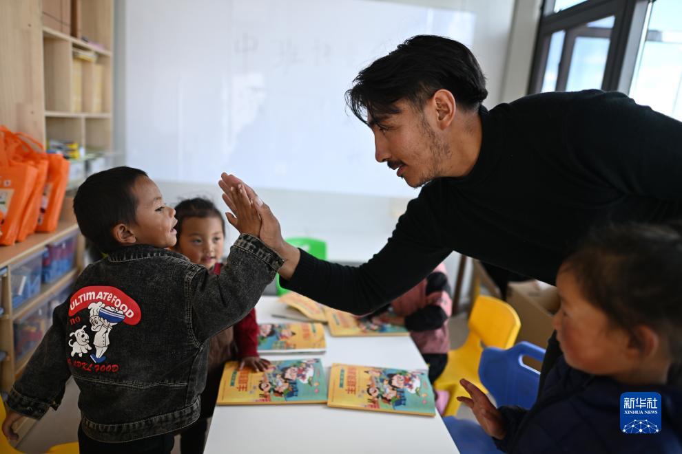 在青海省玉樹(shù)藏族自治州曲麻萊縣秋智鄉(xiāng)布甫村陽(yáng)光幼兒園,秋智鄉(xiāng)幼兒園副園長(zhǎng)才仁戰(zhàn)斗(右二)在課堂上和小朋友互動(dòng)(9月14日攝)。新華社記者 張宏祥 攝