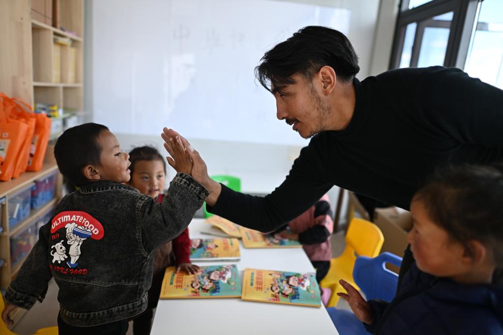 在曲麻萊縣秋智鄉(xiāng)布甫村陽(yáng)光幼兒園,秋智鄉(xiāng)幼兒園副園長(zhǎng)才仁戰(zhàn)斗(右二)在課堂上和小朋友互動(dòng)(9月14日攝)。新華社記者 張宏祥 攝