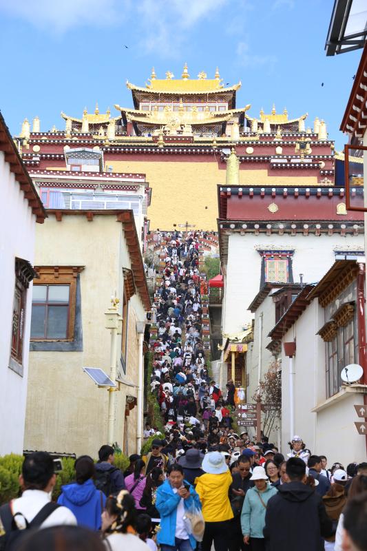 擁有著“小布達(dá)拉宮”和“藏族藝術(shù)博物館”之稱的噶丹·松贊林寺人氣高漲,不少游客身著藏民族服飾欣喜地在景區(qū)寺院的金頂、黃墻下合影留念。景區(qū)外車水馬龍,停車場(chǎng)及公路沿線兩側(cè)停滿了來自全國各地的自駕游車輛,交警及景區(qū)工作人員井然有序的指揮著交通。景區(qū)內(nèi),游客源源不斷,在上車點(diǎn)排起了長隊(duì),工作人員忙碌地指引著游客按秩序檢票上車,“人實(shí)在太多了,假期以來從早上7點(diǎn)至晚上7點(diǎn)半都有游客進(jìn)出,19輛擺渡車都在不停運(yùn)行?!币晃痪皡^(qū)工作人員告訴記者。