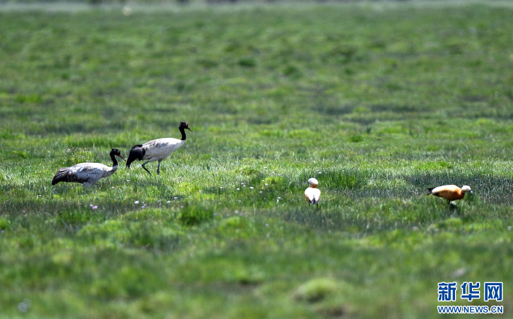 圖為黑頸鶴結(jié)伴覓食。桑吉才讓 攝