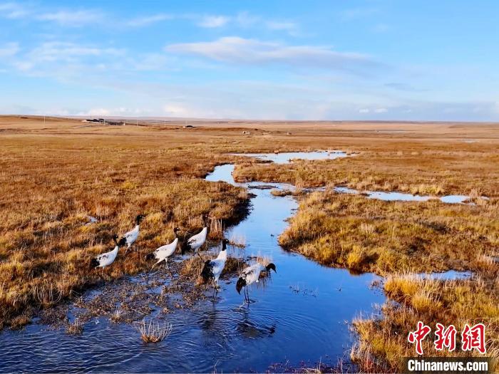 金秋十月,位于青海湖北岸的草原一片金黃。攝影愛好者在青海省海北藏族自治州剛察縣吉爾孟鄉(xiāng)日格加柔地區(qū),拍攝到六只黑頸鶴在這里“安家落戶”,它們或擠在一起沐浴秋日的暖陽,或三五成群覓食嬉戲、閑庭信步,為草原增添了一份靈動與生機(jī)。黑頸鶴被稱為“高原仙子”“鳥類大熊貓”,是全球十五種鶴類中唯一在高原繁殖和棲息的鶴類。