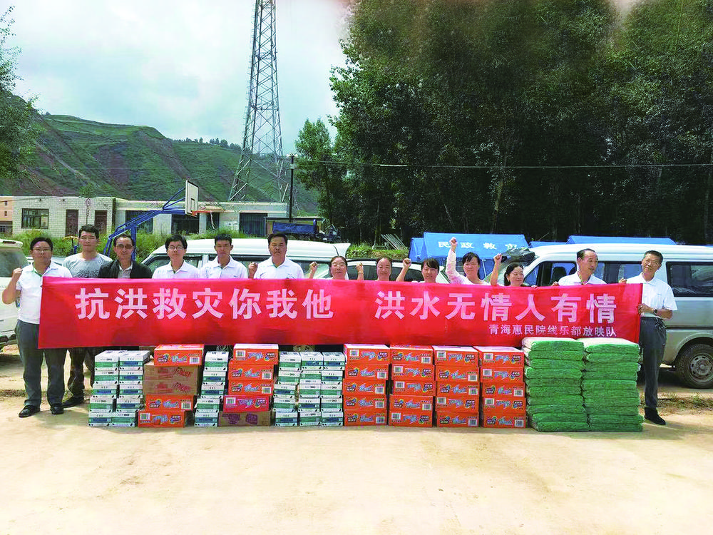 2022年,樂都區(qū)中壩藏族鄉(xiāng)發(fā)生洪災(zāi),黃得梅帶頭捐款,放映隊16名放映員買了一車方便面、牛奶、礦泉水和掛面送到了中壩。雖然洪水把很多路段都沖斷了,但是隊員們硬是用架子車把設(shè)備拉了上去,把溫暖和光影送給了受災(zāi)群眾。