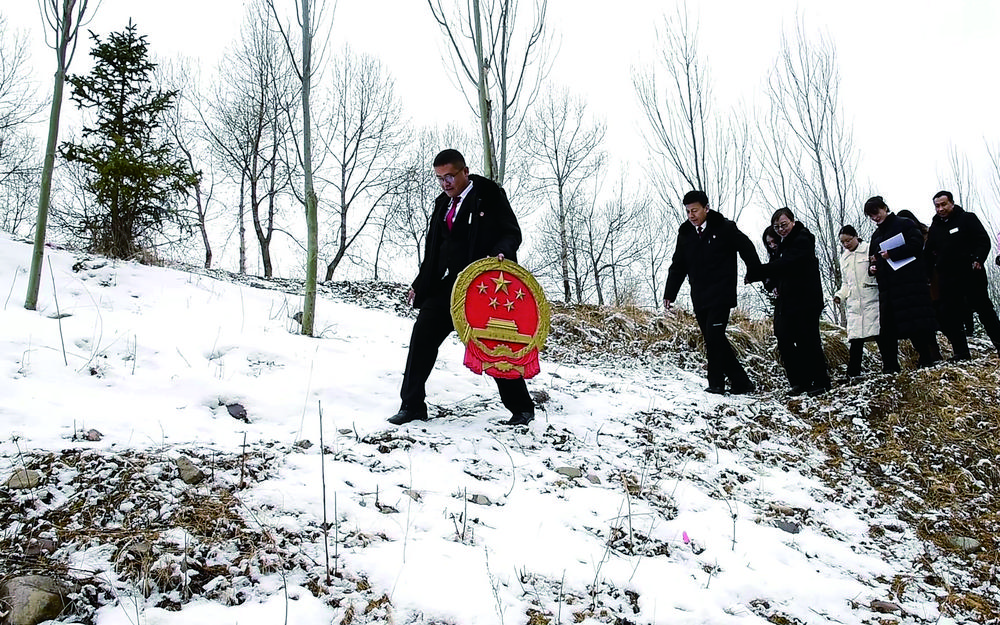 互助土族自治縣人民法院家事審判團隊法官迎著漫天的飛雪,手捧國徽,入村開展巡回審判。省高級人民法院供圖