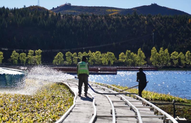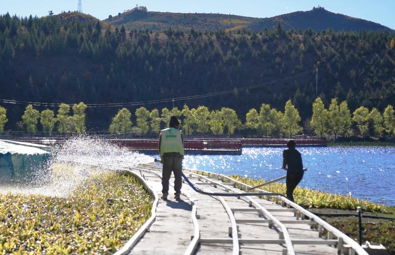 圖為工人在拉姆央措湖畔鋪設(shè)環(huán)湖步行棧道、鋪貼路面石板。目前,拉姆央措湖保護(hù)治理與生態(tài)修復(fù)基礎(chǔ)設(shè)施建設(shè)工程已完成總工程量的95%,正加緊推進(jìn)路面石板鋪貼、木棧道安裝、吸煙亭改造等掃尾工作。拉姆央措湖水清景美煥新顏。