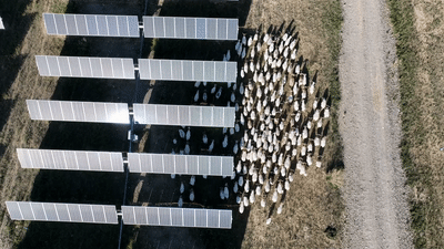 在深藍(lán)色的光伏板下,郁郁蔥蔥的牧草向上生長(zhǎng),園區(qū)里的“光伏羊”啃食青草,奔跑追逐,成為當(dāng)?shù)匾瞬毮康娘L(fēng)景。