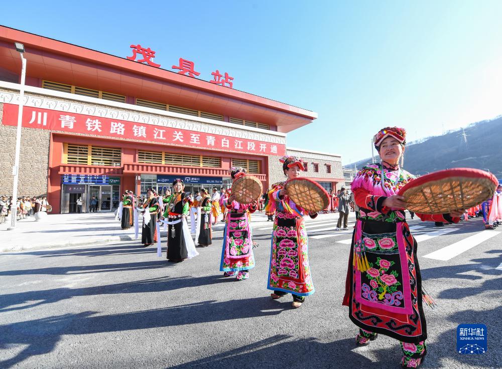 11月28日,在川青鐵路茂縣站,當(dāng)?shù)馗髯迦罕娫谡厩皬V場慶祝鐵路開通運(yùn)營。新華社記者 王曦 攝