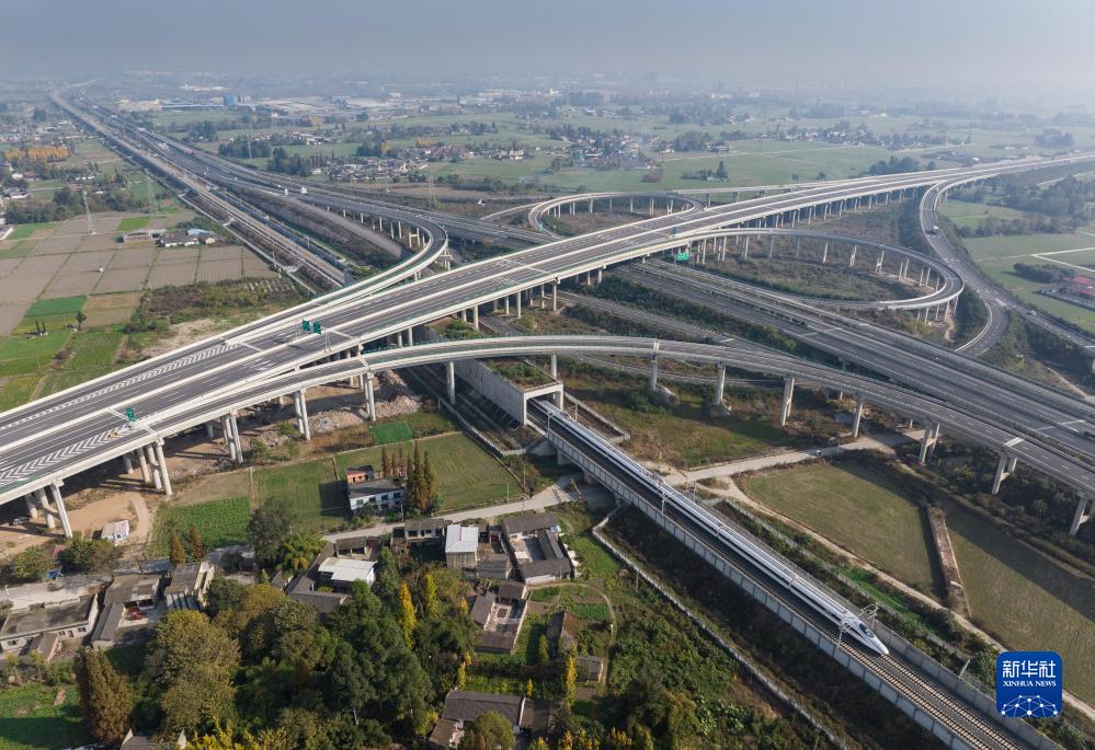 11月28日,首發(fā)列車C6008次列車行駛在川青鐵路上,該段與成萬高速并行、與成都都市圈環(huán)線高速交會(huì)(無人機(jī)照片)。新華社記者 江宏景 攝