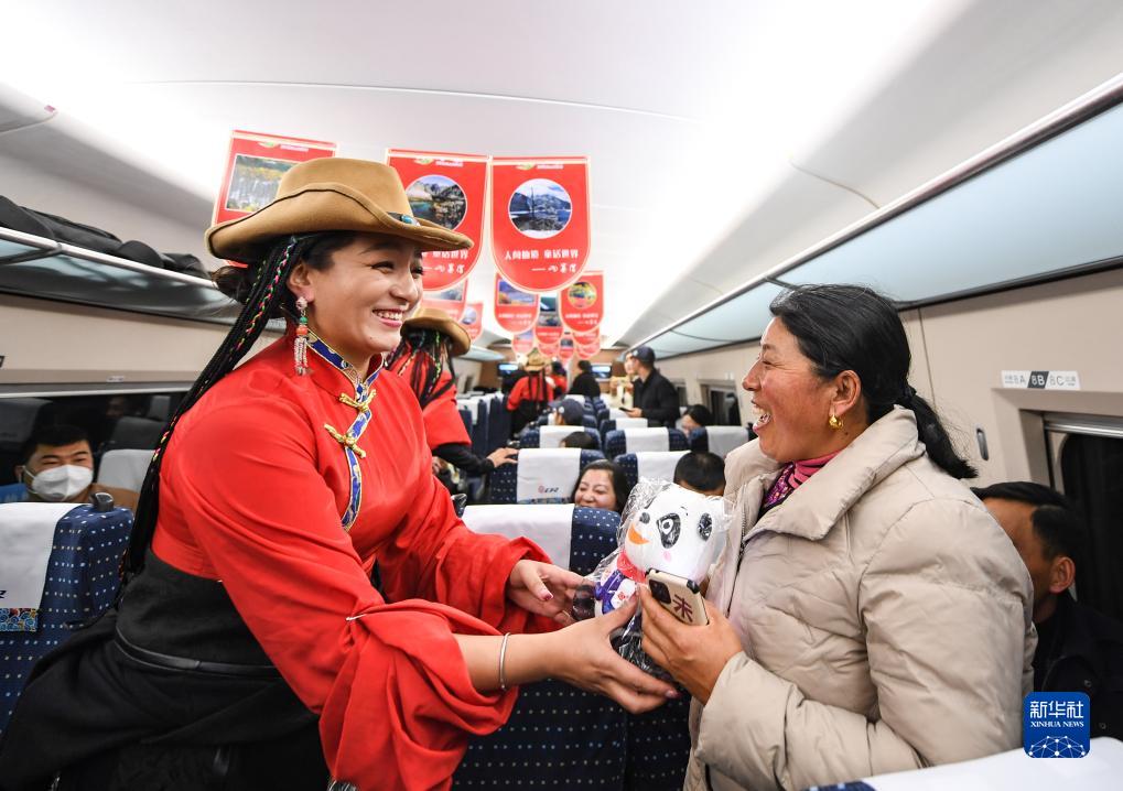 11月28日,在C6008次首發(fā)列車上,來自阿壩州民族歌舞團(tuán)的演員給乘客贈(zèng)送紀(jì)念品。新華社記者 王曦 攝