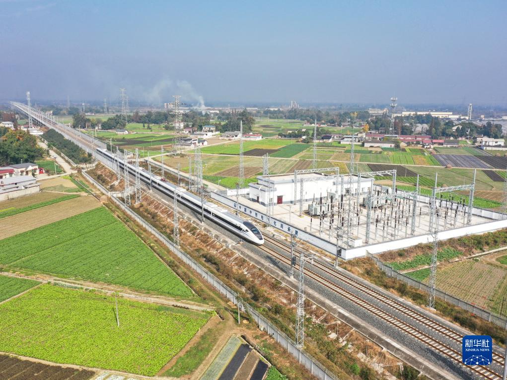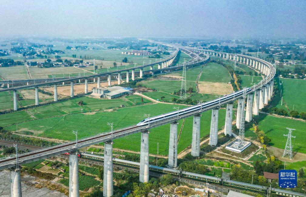 11月28日,在成都市青白江區(qū)境內(nèi)拍攝的行駛在川青鐵路上的列車(上)和行駛在西成高鐵線上的列車(下)(無人機(jī)照片)。新華社記者 王曦 攝