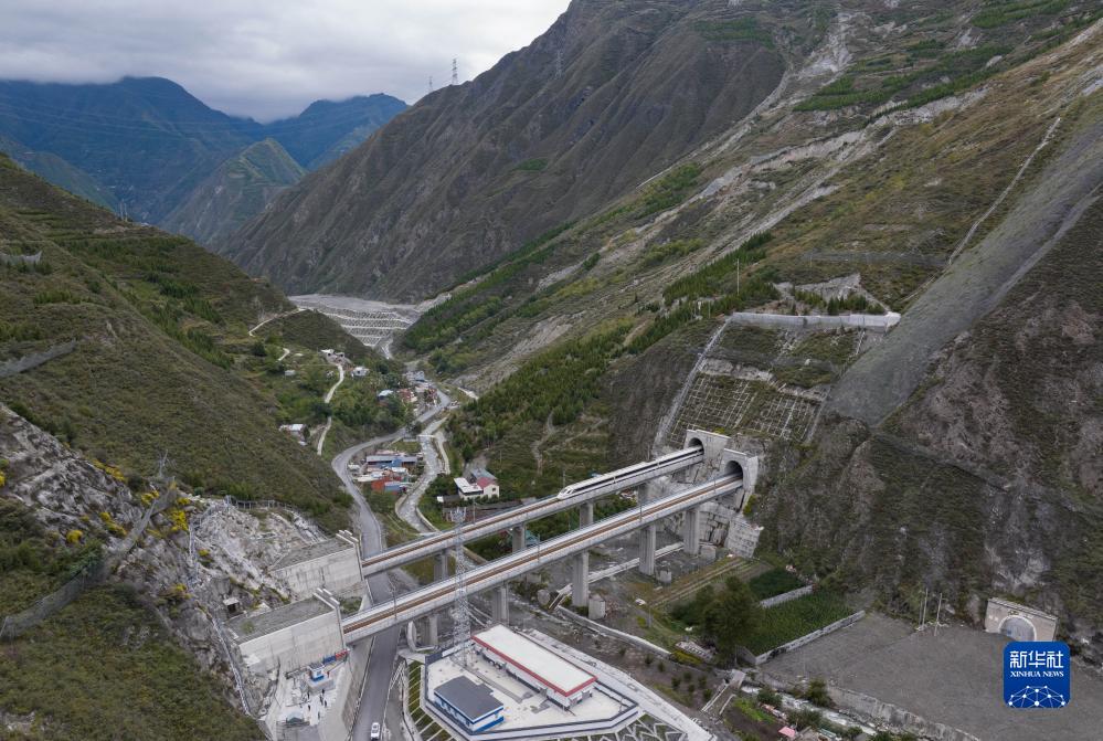 調(diào)試列車駛過川青鐵路榴桐寨隧道(10月12日攝,無人機(jī)照片)。新華社記者 王曦 攝