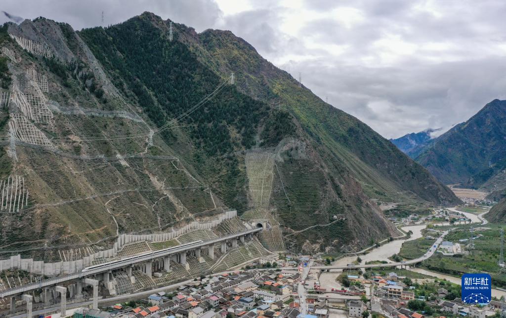 列車停靠在川青鐵路鎮(zhèn)江關(guān)站,該站毗鄰岷江,站臺(tái)跨越317國道(11月13日攝,無人機(jī)照片)。新華社記者 江宏景 攝