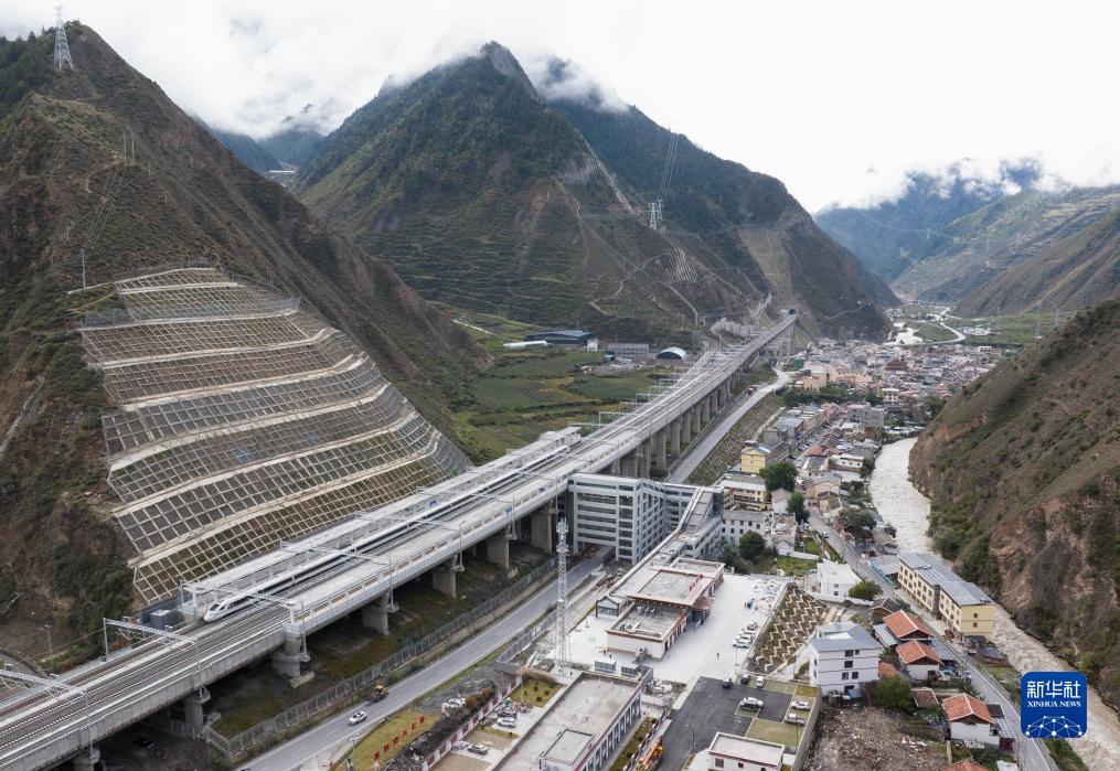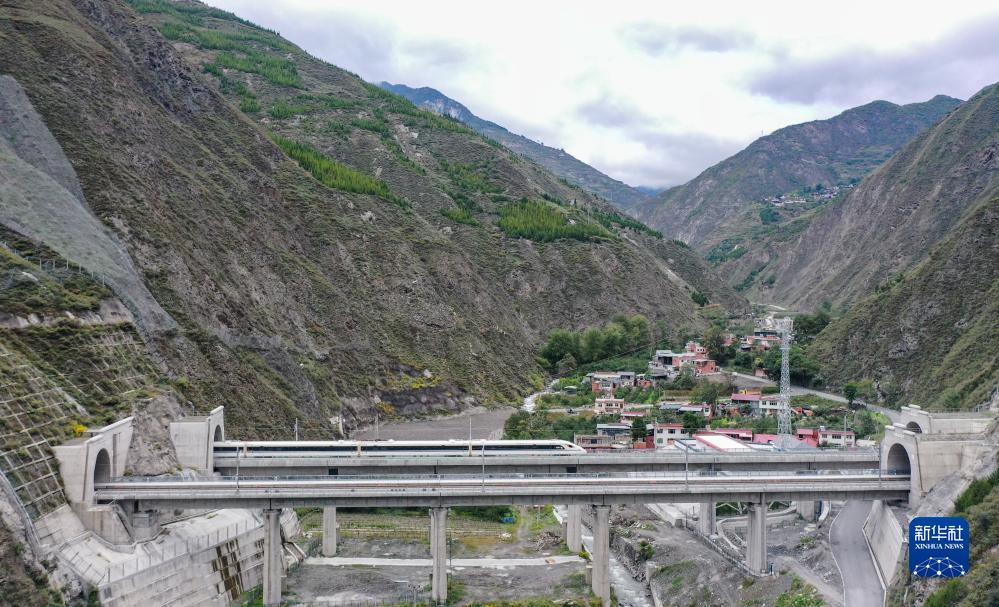 調(diào)試列車駛?cè)氪ㄇ噼F路茂縣站(10月13日攝,無人機(jī)照片)。新華社記者 王曦 攝
