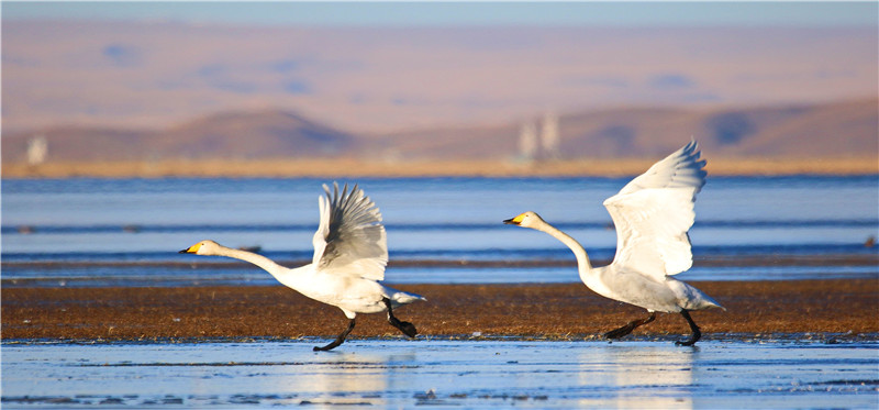 冬日的青海湖,一碧千里沒有雜色。湖面像一層薄薄的透明玻璃,晶瑩剔透,湖岸周圍是金黃的草場(chǎng),遠(yuǎn)處是高聳入云的雪峰,潔白的天鵝恰似水中仙子,伸展雙翼,引翅拍水,蕩漾著水波,構(gòu)成一幅冬日美景圖。[詳細(xì)] -