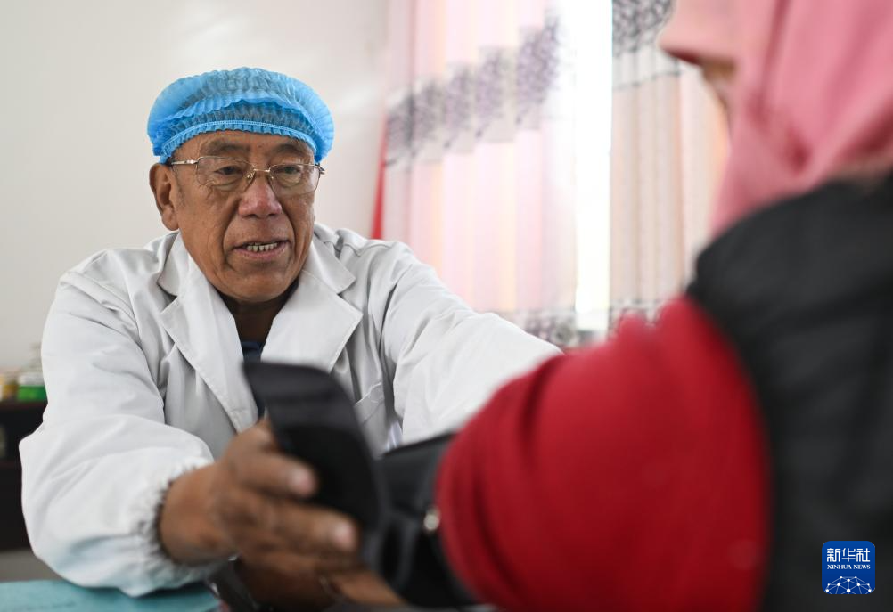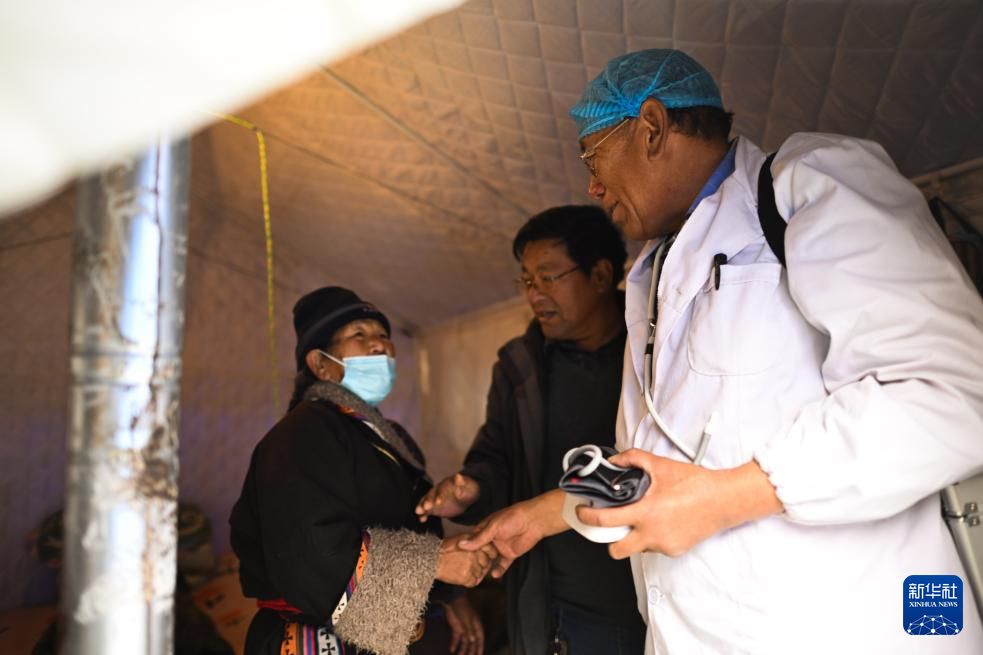 12月22日,完么仁增在牙木村應(yīng)急醫(yī)療點為村民量血壓。新華社記者 張龍 攝