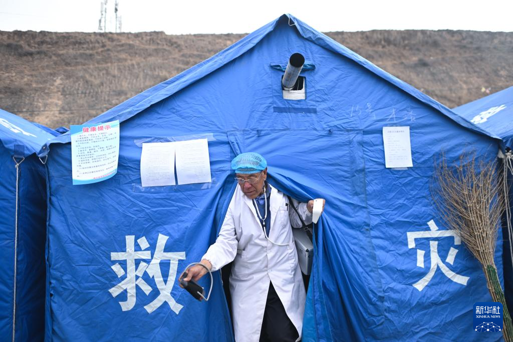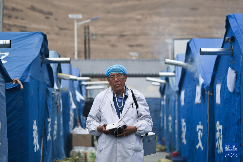 12月22日,完么仁增在牙木村安置點測量完群眾血壓后走出帳篷。新華社記者 張龍 攝