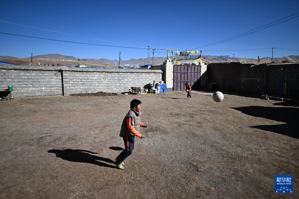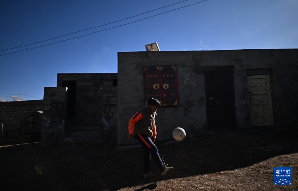 青海玉樹曲麻萊縣約改鎮(zhèn)中心寄宿制學(xué)校學(xué)生悟金唐巧多杰在家中踢球,作為曲麻萊青訓(xùn)隊(duì)一員,他即將前往廣西壯族自治區(qū)北海市參加球隊(duì)冬訓(xùn)(1月12日攝)。新華社記者 韓方方 攝