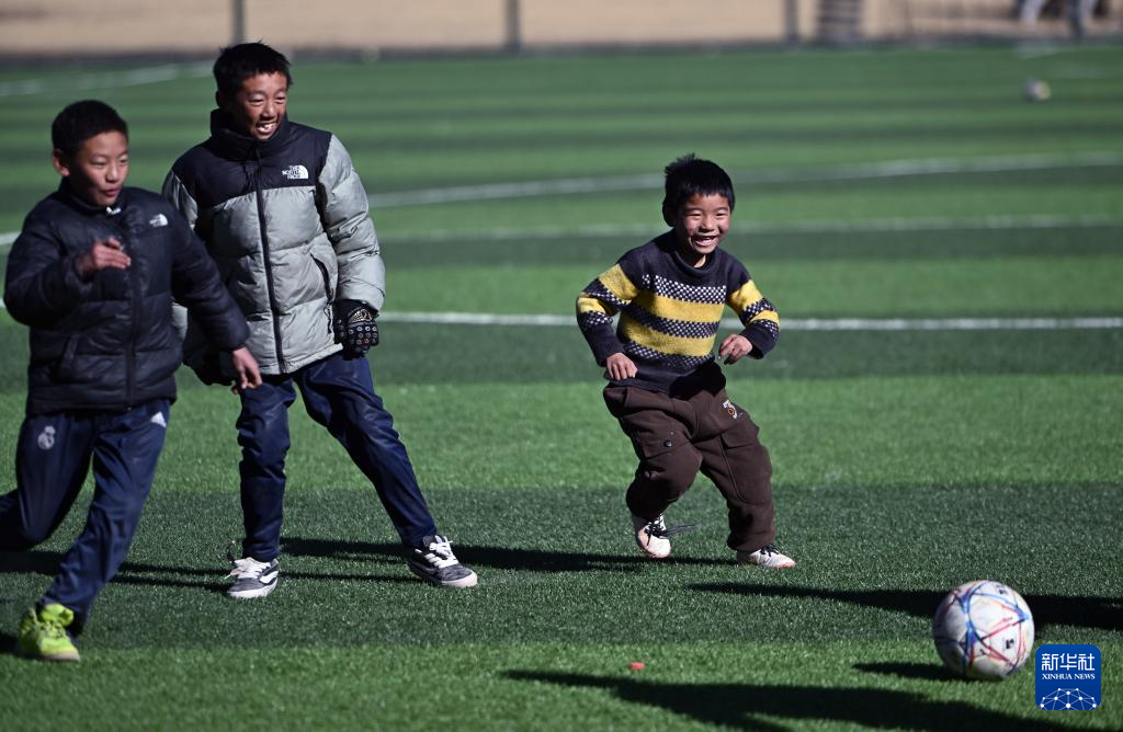 青海玉樹曲麻萊縣葉格鄉(xiāng)寄宿制小學(xué)學(xué)生卓瑪加(右)和伙伴們?cè)谇驁?chǎng)踢球(1月12日攝)。新華社記者 韓方方 攝