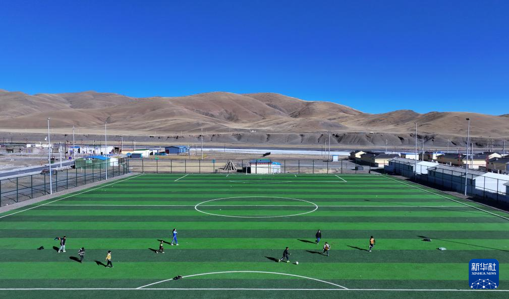 1月12日,孩子們?cè)谇嗪S駱淝槿R縣葉格鄉(xiāng)足球場(chǎng)上踢球(無(wú)人機(jī)照片)。新華社記者 韓方方 攝