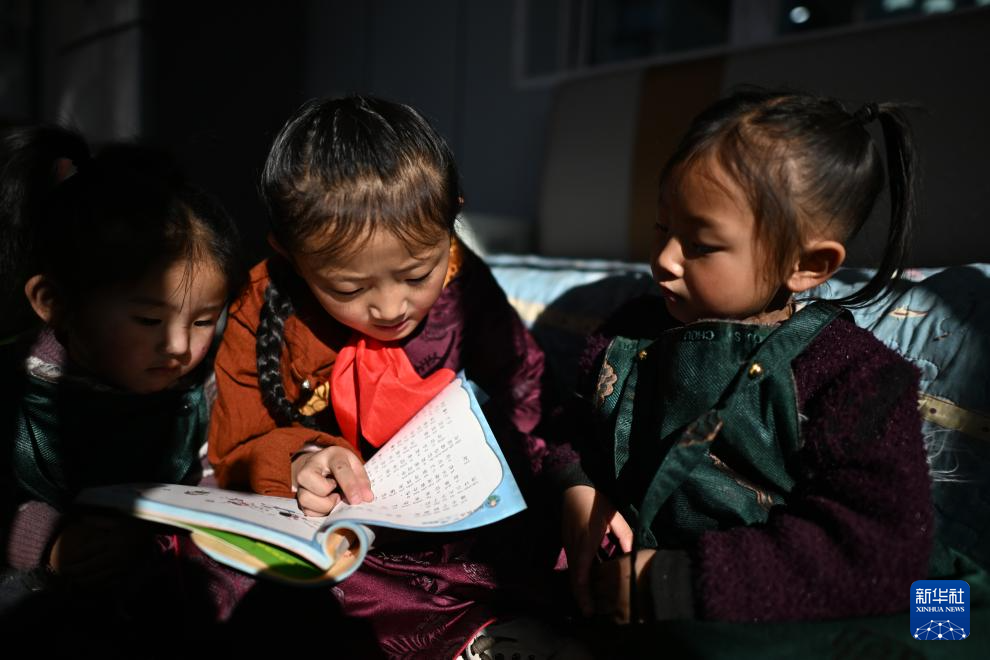 青海玉樹曲麻萊縣第二民族完全小學(xué)學(xué)生達(dá)沙旦增德金(中)在家中給妹妹講故事(1月12日攝)。新華社記者 張宏祥 攝