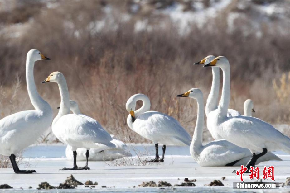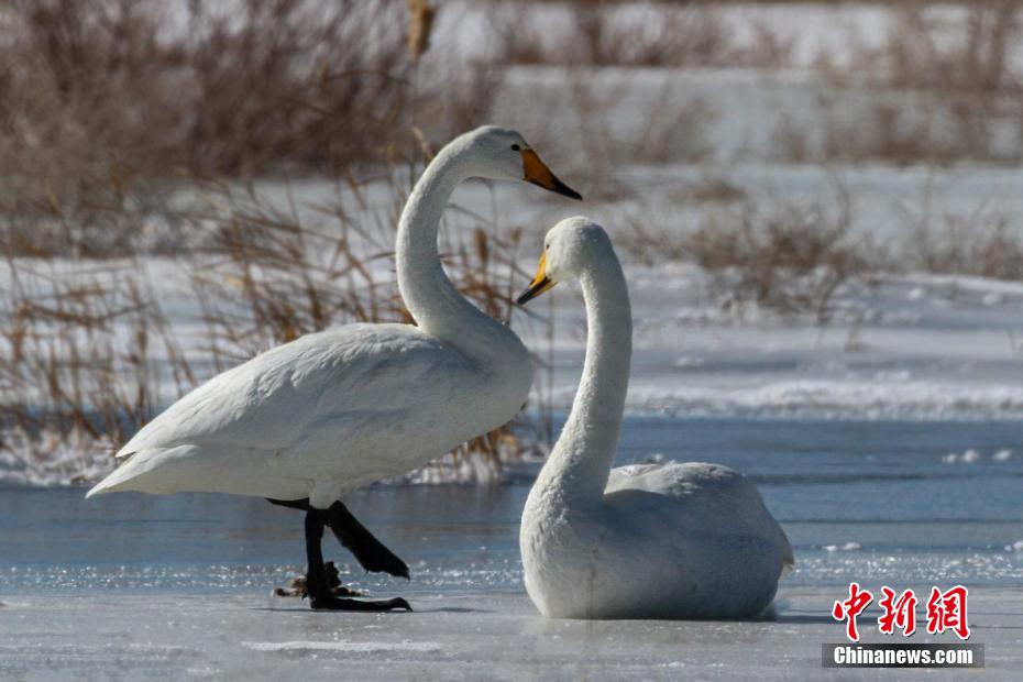 天鵝在湖冰上休憩。青??婶斂撕?托素湖省級自然保護區(qū) 供圖