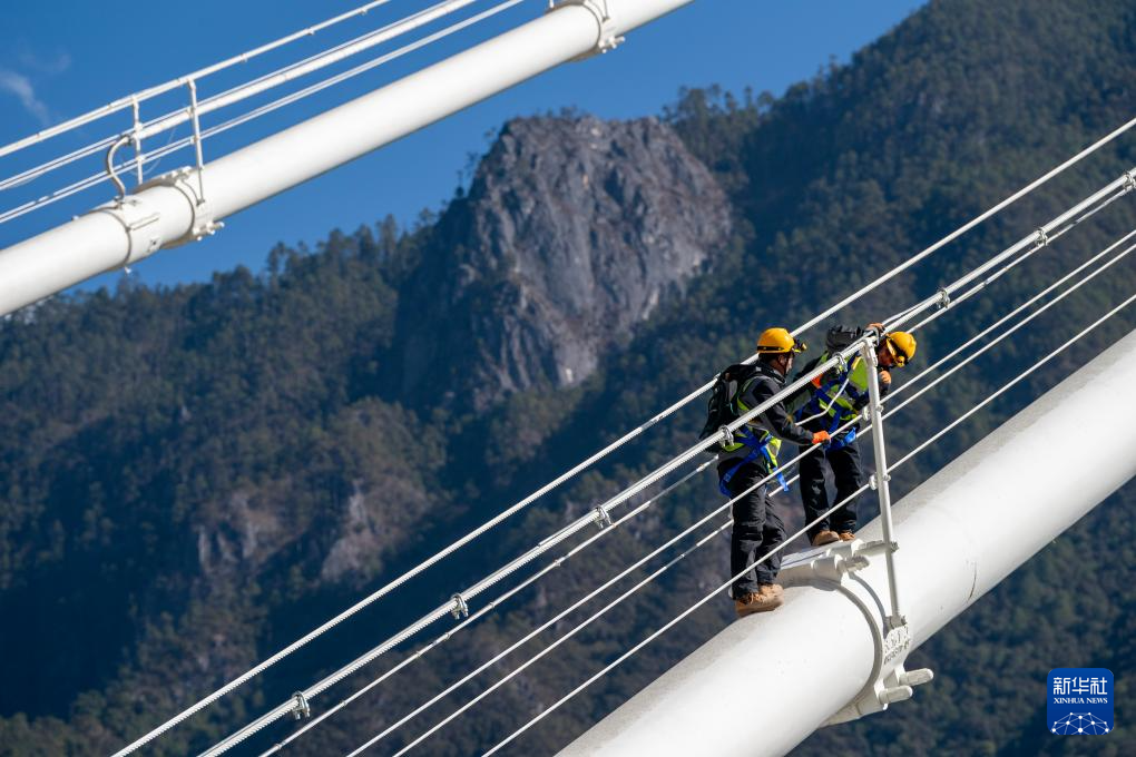 1月24日,工區(qū)班長楊應(yīng)文(右)和工友劉榕基在主纜上巡檢。新華社記者 陳欣波 攝