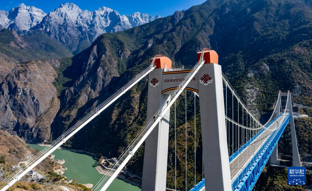 1月24日,列車通過虎跳峽金沙江鐵路大橋,遠(yuǎn)處是玉龍雪山(無人機(jī)照片)。新華社記者 陳欣波 攝