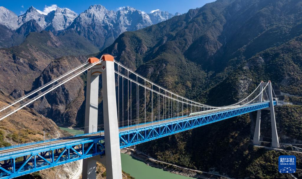 虎跳峽金沙江鐵路大橋位于云南麗江與香格里拉交界處的虎跳峽景區(qū),橫跨金沙江,全長882.5米,主跨達(dá)660米,橋面離江面垂直距離約250米,大橋兩端分別與玉龍雪山隧道和哈巴雪山隧道連接,是麗香鐵路重點(diǎn)控制性工程。
