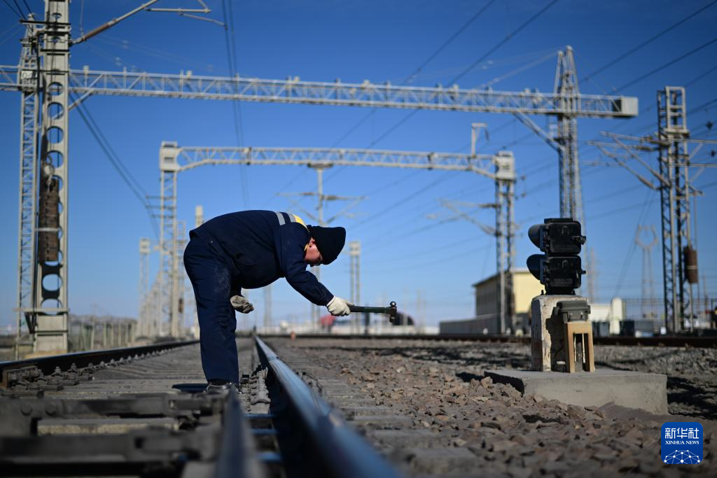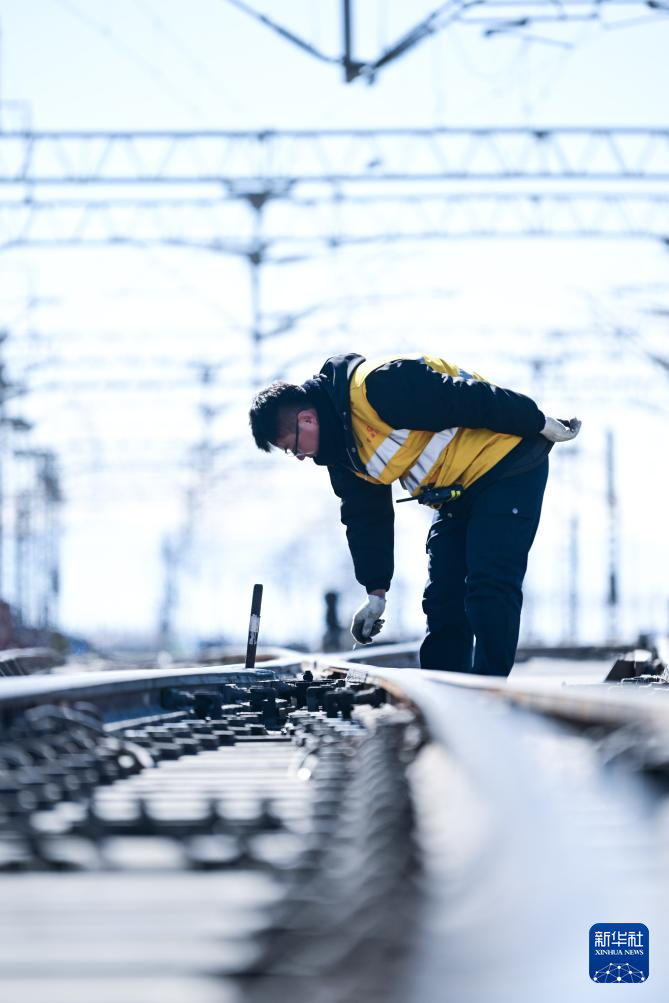 1月29日,格爾木電務(wù)段格爾木東信號(hào)車(chē)間察爾汗信號(hào)工區(qū)職工楊正宏在對(duì)察爾汗站道岔進(jìn)行檢修作業(yè)。新華社記者 張龍 攝