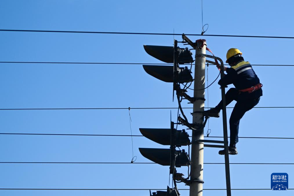 1月29日,格爾木電務(wù)段格爾木東信號(hào)車(chē)間察爾汗信號(hào)工區(qū)職工何江東在高柱信號(hào)機(jī)上檢查信號(hào)機(jī)安裝螺絲是否緊固。新華社記者 張龍 攝