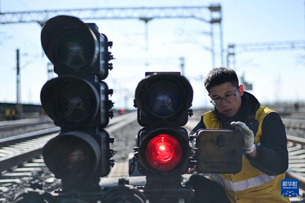 1月29日,格爾木電務(wù)段格爾木東信號(hào)車(chē)間察爾汗信號(hào)工區(qū)副工長(zhǎng)張世鐸在檢修信號(hào)機(jī)。新華社記者 張龍 攝
