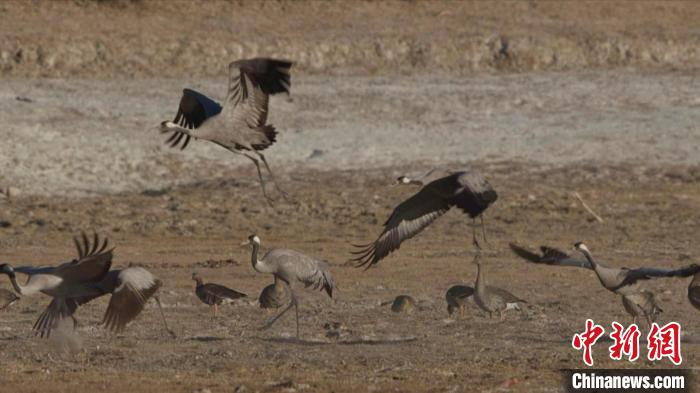 圖為灰鶴群在草地上嬉戲。仁增加措 攝