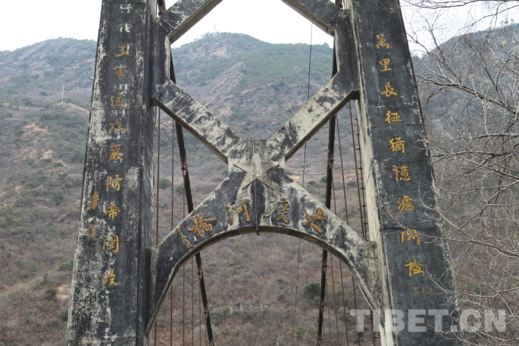據(jù)了解,大渡河橋東西橋頭塔高分別為16米,孔徑132米,橋面4.5米,由27根直徑約3厘米大小的綱繩分布于左右兩側(cè),中間分別由45根同樣大小的鋼纜吊桿將橋身懸吊在大渡河上,橋身由無數(shù)鋼架鉚焊而成,鋼架之上鋪有約0.5米見方的方橙枕木,上鋪“人”字型拼木,允許載重量15噸。東西橋頭分別建有堅固的崗?fù)ぃ鳂蝾^正面豎有三道屏墻,左為原中國人民解放軍第十八軍軍長張國華,政委譚冠三撰寫的碑文,中間書有毛澤東同志七律《長征》詩手跡,右為建橋工程說明。