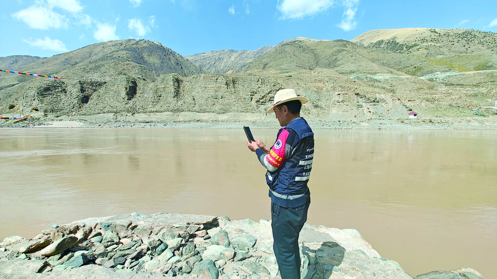 4月23日下午3時左右,洛松才仁騎著摩托車行駛在通天河畔,時而停下來用手機記錄著河流、河道的情況,時而走到河邊靜靜地望著東流的河水。