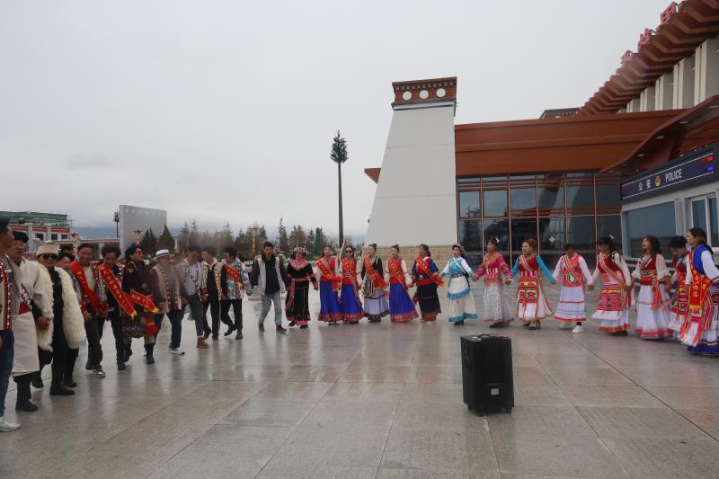 5月5日下午2點半,陰雨中的麗香鐵路香格里拉站,一曲曲歡快的傈僳族打跳,引來眾多游客和乘客駐足觀看,大家紛紛拍照合影,有的還加入學(xué)跳。